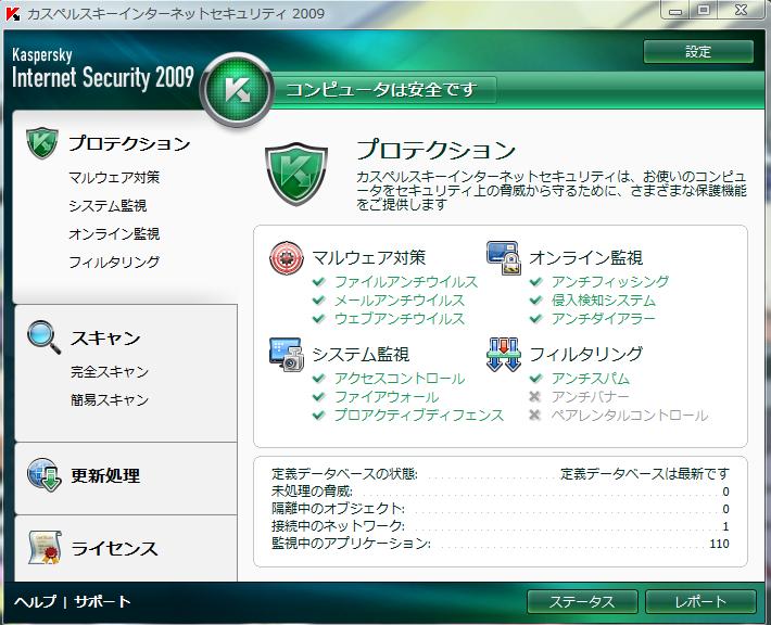 今まではNOD32を使っていたんですが、スペックにも余裕があるしもっと高性能なウイルスセキュリティがほしかったので、Kaspersky Internet Security 2009(以下KIS)を導入しました。